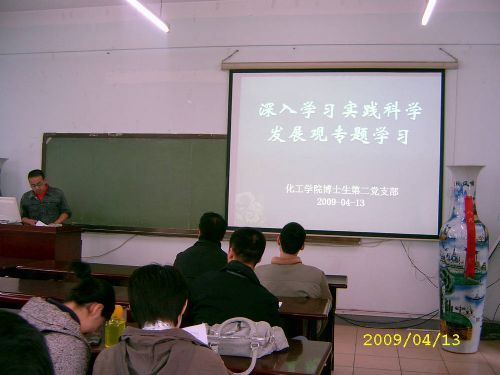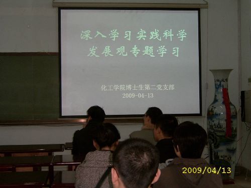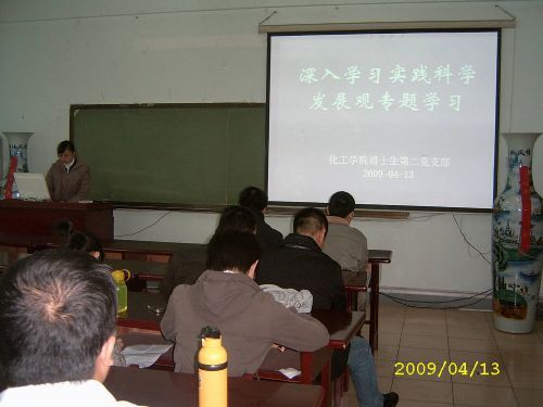 2009年4月13日上午10:00,在理学楼901会议室,化工公司博士生第二党支部书记徐宇虹同学主持召开了“深入学习实践科学发展观,加强学术道德和学风建设”讨论会,化工公司博士生第二党支部全体党员和积极分子参加了本次讨论会。