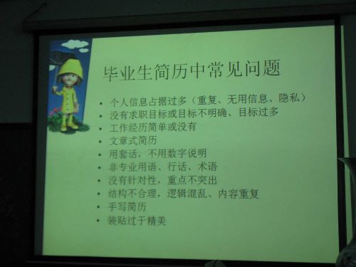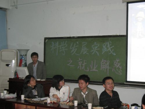 曾林介绍了这次活动的意义,并对目前就业形势进行分析。07级硕士第一党支部书记刘彪总体介绍了师兄师姐的就业情况,随后王洪宇、王向慧、李崇幸等8位同学分别从就业、报考公务员等方向介绍了他们的经验和并对08级硕士研究生提出了相应的建议。