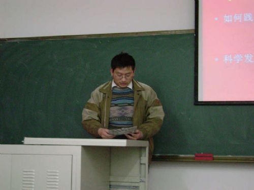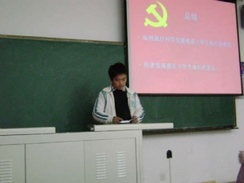班长严鹏丽同学对科学发展观的学习目的和将要开展的活动进行了介绍,并向同学传达了在“关于‘深入落实科学发展观’的全校师生代表讨论大会”上崔国兰书记将科学发展观浓缩为“一一三一”的精神,即“一”要义是发展,“一”核心是以人为本,“三”基本要求是全面、协调、可持续,“一”根本方法是统筹兼顾。本着把科学发展观落到实处的精神,严鹏丽同学又针对目前班级成员的学习生活状况以及社会环境就寝风、学风、考研、工作招聘四个方面与各位班级成员们进行了对自己的发展方向的选择和目前的国际形势进行了探讨,引起了班级成员对毕业后自己去向的深入思考。