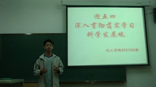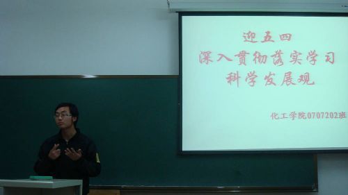 为深入学习实践科学发展观,迎接五四90周年纪念日的到来,化工公司0707202团支部于4月25日晚在正心楼308召开了以“迎五四,促发展”为主题的班会。
