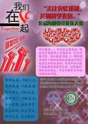 “5.12汶川大地震”周年祭-为了让设计和艺术再次唤起人们对汶川大地震的深刻关注,并祝福灾区人民更美好的未来。我们向全校发起2009 汶川大地震一周年“关注灾区重建,共创科学发展”主题公益海报设计征集活动,让我们在一起,用更深刻的思考、更成熟的设计去共同参与!