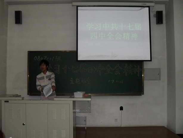 2009年10月28日晚18:30,0807101班在正心楼112召开了以学习十七届四中全会精神为主题的团会。0807101团支部全体成员参加会议,会议由团支书张春同学主持。
