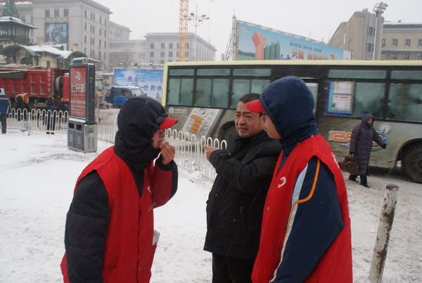12月5日、6日两天上午,化工公司共有40余名志愿者参与了此项活动。博物馆转盘道临近火车站和多个大型商场,人流量和车流量都相当大,志愿者们顶着凛冽的寒风和满天飞舞的雪花,在路口处时刻注意现场的交通情况,做出正确的判断,引导行人过路,以保证行人的安全,进行交通安全宣传并发放交通安全知识宣传品。