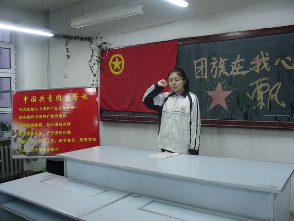 在宣誓仪式上同学们庄严的举起右拳, “我志愿加入中国共产主义青年团……勤奋学习,积极工作,吃苦在前,享受在后,为共产主义事业而奋斗!”
