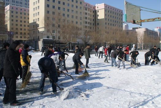 志愿者们分为积雪清理和广告清理两个小组开展活动。虽然篮球场上积雪很厚,室外温度也很低,但这些并未影响志愿者们的热情。他们齐心协力,不到两个小时积雪就被清扫完毕;负责清理校园广告的同学们也热情高涨,他们沿着校园主干街道清理宣传栏和墙壁上的广告,并将校园内几处不易清扫的地方的打扫干净。
