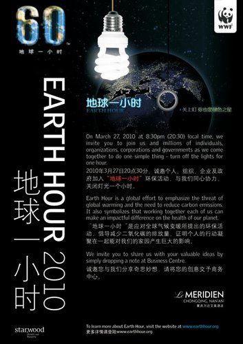 我们共同拥有一个家——地球,但如今,我们的家正在不断地遭到破坏。日益严重的自然灾害正在不断地向我们发起挑战。为了应对全球气象变化,世界自然基金会于2007年在悉尼发起了名为“地球一小时”的拯救地球活动。 附:2010年“地球一小时”活动指南 “地球一小时”是WWF为应对全球气候变化所发起的一项可持续性的全球活动,号召个人、社区、企业和城市在每年3月最后一个星期六 20:30-21:30熄灯一小时,旨在通过一个小小动作,让全球的民众共同携手关注气候变化,倡导低碳的生活生产方式——小小改变就可能成就深远影响。 “地球一小时”之世界史 2007 年3 月31日19:30,悉尼220 多万个家庭和企业关灯一小时。作为“地球一小时”的源起,悉尼率先向全球发出了“行动起来,遏制全球变暖”的倡议。 2008 年3 月29 日20:00,“地球一小时”活动拓展到了全球,世界各地城市和数以百万的人们为应对气候变化,团结起来,开始行动。 2009 年3 月28 日20:30 ,来自88个国家的4159个城市的数亿人,其中包括 73个国家的首都、世界十个人口最多城市中的九个,以及北京的鸟巢、水立方、上海的东方明珠塔、世界金融中心、吉萨的狮身人面像和金字塔、巴黎的埃菲尔铁塔在内的全球地标建筑都关灯一小时,表达了应对气候变化的立场。“地球一小时”2009也因此成为了世界上最大的自发性环保活动。 “地球一小时”之中国史 2009年,“地球一小时”活动来到中国。北京的鸟巢、水立方,上海的东方明珠塔、世界金融中心,保定市政府大楼、中国首个太阳能光伏大厦——电谷锦江国际酒店,大连的星海广场,南京玄武湖、新街口,香港的维多利亚港湾等全国地标建筑都在3月28号20:30熄灯一小时,向世界传达中国应对气候变化的决心。 2009·保定 有“中国电谷”之称的保定是内地首个官方宣布加入该活动的城市。保定市政府在高新区中国首座太阳能光伏大厦——电谷锦江国际酒店举行“地球一小时”活动启动仪式,保定市政府有关领导、世界自然基金会(wwf)高层出席活动并致辞。 奥运冠军庞伟作为保定“地球一小时”代言人出席仪式。 2009·上海 大型广场与大厦的LED屏幕上滚动播出活动宣传片。 市民与身着活动T-Shirt的“大熊猫”合影,并领取活动贴纸,把“地球一小时”带回家。 当地的碳中和酒店举办“地球一小时之夜”,熄灯、点燃蜡烛并以低价吸引顾客在此无限畅饮一个低碳的夜晚。 超市收银员身着“地球一小时”T-Shirt进行宣传。 2009·北京 除鸟巢、水立方等标志性建筑熄灯外,许多大型超市与办公楼采取长期的部分熄灯措施或使用更低功率照明设备。 在厂家的经销店中摆放各种“地球一小时”活动海报,向消费者推广此次活动。 网友自发组织百人大定格活动,以定格3-5分钟的形式让更多的公众增强对“地球一小时”的了解市天文台响应节能号召,邀请市民到天文台观察太空,以这种更自然的方式代替平日耗能的夜生活 2009·香港 香港1800多座大厦、600多家公司和160所公司一齐熄灯支持环保。 当地电台邀请陈奕迅等香港明星以现场电话的方式邀约普通听众共同熄灯,度过一个低碳的夜晚。 2009·大连 摇滚明星举行不插电音乐会,在每站巡演开始前宣传环保知识,并在演出前熄灯一分钟,以声援WWF“地球一小时”的活动。 2009·天津 天津小员工听取环保讲座,参加活动并积极向家人宣传“地球一小时”活动。 “地球一小时”2010的希冀 “地球一小时”是一个鼓舞人心且易于实施的活动,旨在通过一个小小动作,让全球的民众共同携手关注气候变化,倡导低碳的生活生产方式。“地球一小时”2010的活动将继续号召每个人承担责任,为确保一个可持续的未来发挥自己的作用。 地球一小时”2010年的目标是:通过全球6000多个城市、超过10亿人的参与,政府、企业、社区的积极加入,使“地球一小时”成为世界上规模最大的环保行动。 今年的“地球一小时”将不仅是一个熄灯仪式,更是一个把节能理念落实到行动的活动。我们将在3月22日-3月26日推出“地球一小时低碳生活周”,呼吁大家采取行动在日常的生活和生产中做出真正的改变,为实现国家“十一五”能源强度降低20%和到2020年碳排放强度下降40-45%的目标做出支持和贡献。 “地球一小时”作为提高公众环保意识的一项活动,仅仅是一个开始。熄灯之后提倡节约能源和环境保护所带来的变化才是真正的意义所在。 加入我们非常简单,只要在我们的中英双语“地球一小时”中国网页(www.earthhour.org.cn)注册,您就能从上面获得各种帮助和支持。 2010“地球一小时”的时间安排 3月22日——3月26日:“地球一小时低碳生活周” 3月22日 周一 家庭节能——利用循环水,节约一公斤水资源² 3月23日 周二 办公室节能——少用10张打印纸² 3月24日 周三 低碳出行——选择公共交通,少开一天私家车² 3月25日 周四 低碳购物——自带环保袋,拒绝塑料袋² 3月26日周五 节约能源——关掉不必要的灯、关闭不使用的电器插座,节约一度电² 3月27日:派摄影师捕捉“熄灯”地区和建筑物的照片,并举办“地球一小时”的庆祝活动,邀请嘉宾、当地媒体和公众参加。 3月28日:通过新闻发布会或新闻稿的方式传达“地球一小时”活动的成功,并与当地传媒分享地球一小时“之前”和“之后”的照片与心得。 2010 地球一小时期间您可以: o参加当地