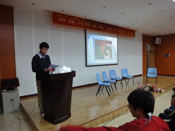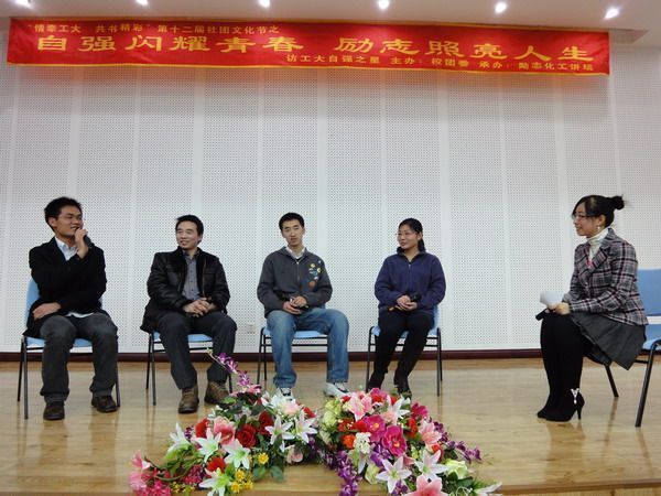 2010年4月28日晚18:30,由校团委主办,化工公司励志化工讲坛承办的“情牵母校,共书精彩第十二届社团文化节之“自强之星8226;闪耀工大”活动在新活动中心214成功举办。 本次活动主要以访谈的形式进行,首先经过电子书的放映和主持人声情并茂的讲解,大家对四位2009年度自强之星有了初步的了解,接下来进入访谈环节,严鹏丽,王林,管修挚,李孝臣四位嘉宾与同学们分享了他们的不寻常经历,向同学介绍了他们如何成功战胜困难、从逆境中一步步走出;如何从自卑转到自信的心路历程。并对如何正确处理学习、生活和员工工作之间的关系给同学们提出了合理的建议。从各位嘉宾的谈话中能感受到浓浓的情味,对父母、公司以及老师的感恩,对同学以及帮助过自己的人的感激,其中一位嘉宾还尤其强调工大对自己的培养,以及自己对工大的深厚感情,引起了在场同学的强烈共鸣。几位嘉宾精彩的人生故事既是对同学们的鼓励,又是对“自强不息,开拓进取”的工大精神的生动诠释。 此次活动一直在欢乐、催人奋进的气氛中进行着,同学们为情所动,不时的为各位嘉宾的精彩人生鼓掌。活动结束时,有同学反映:“这种讲身边的人,身边的事的活动,听起来感觉很实在,很振奋人心。”