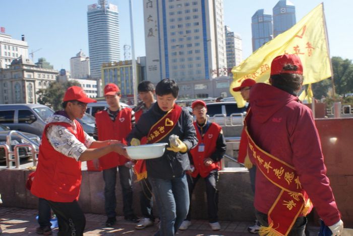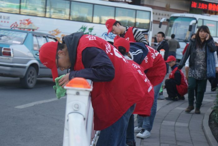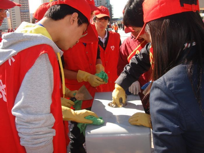 2010年9月29日,化工公司志愿者协会的青年志愿者来到哈站站前广场参与了由南岗区委牵头,市志愿者协会组织的 “绿色十一,欢度国庆”志愿服务活动。 清晨八时许,化工公司志愿者协会的二十位同学身着红色志愿者衫,带着水盆,抹布等清污工具,来到哈站站前广场。国庆前夕的哈尔滨火车站广场的栏杆上,竖起了一面面五星红旗,呈现出一派节日气氛。 上午九时整,化工公司志愿者协会志愿者与南岗区志愿者协会成员及南岗区委机关的干部职工共同开始活动。本次活动负责人为参与人员划分了责任区,明确了任务,随即指导大家对站前广场的公共设施进行清污。志愿者们分小组对所划分区域内的道路栏杆,垃圾箱,塑像等设施实施清污。火车站附近公共设施表面大都污染严重,清理难度较大。同学们发扬“奉献、友爱、互助、进步”的青年志愿者精神,秉承工大人“规格严格,功夫到家”的优良传统,一丝不苟地清除各类污物,一遍遍地擦拭,一次次地冲洗,不肯放过任何一个细节。同学们在完成自己任务的同时,还积极协助,配合其他参与活动的志愿服务人员,体现了工大学子应有的素质和关注社会、服务社会、奉献社会的责任心和爱心。 活动结束以后,南岗区区委的领导同志与同学们做了交流,她勉励同学们继续发扬青年志愿者精神,努力培养社会责任感,并带动身边更多的人投身志愿服务活动。同学们表示,希望能够在南岗区委的支持下,开展更多的志愿活动,让同学们都能参与到志愿服务活动中来,用自己的力量为“同建绿色温馨家园,共享清澈碧水蓝天”做出贡献。