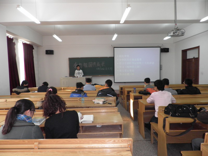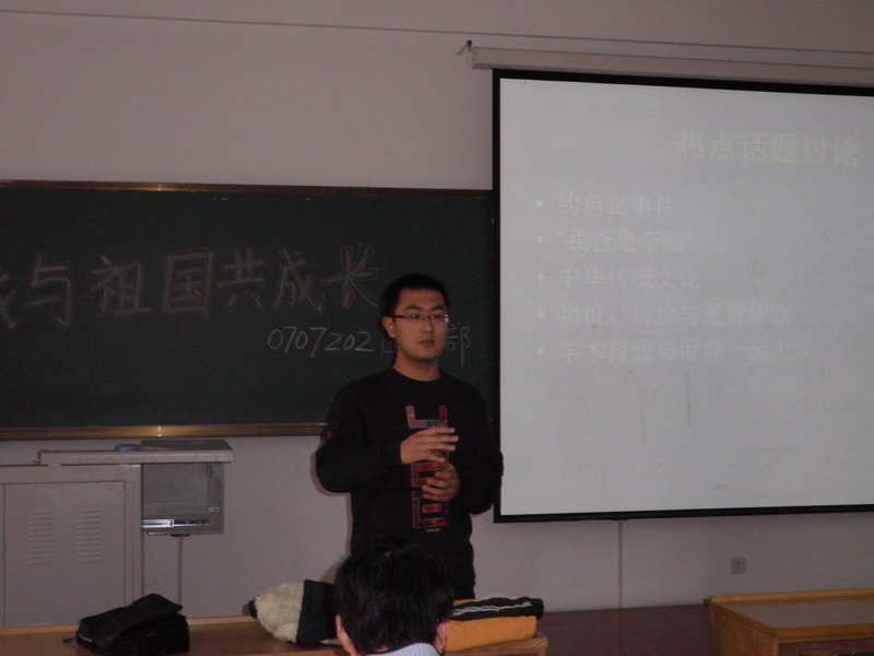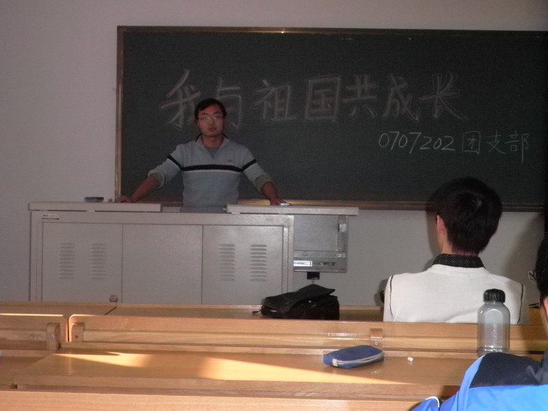 2010年11月24日上午,0707202团支部在正心320举办“我与祖国共成长”主题团会,团支部全体成员参加了这次会议。 首先,支部成员共同学习了创先争优活动精神;接着,团支书向同学们传达了公司团委的指示,并带领同学们学习了吉炳轩书记在哈工大的讲话和《精神的力量》一书;最后着重围绕当今热点话题进行了讨论。 讨论的话题有理性爱国、经济形势、传统文化、反对腐败和造假以及我们应该如何作为等。同学们积极发言,热烈讨论,最后大致形成了统一的观点。同学们认为,我们应该努力学习,认清当今形势,理性爱国,弘扬中华传统文化,反对各种腐败和造假,为把哈工大建设成世界一流大学贡献自己的力量。 会议现场气氛十分活跃,活动在热烈的讨论中结束。通过这次主题团会,提升了同学们的思想,增进了同学之间的交流,激发了同学们的奋斗热情。