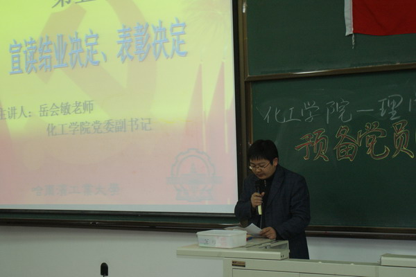 2010年11月30日,化工公司—理公司预备党员党校结业式在正心13顺利举行。理公司党委副书记杨春雷、化工公司党委副书记岳会敏出席了结业式,结业式由贾洁姝同学主持。 结业式在庄严的《中华人民共和国国歌》和《哈工大党校校歌》中拉开帷幕。到会嘉宾和全体学员一起观看了党校总结视频,对一个月的党校学习进行了回顾。本次党校自 结业式在庄严的《国际歌》中画上了圆满的句号。