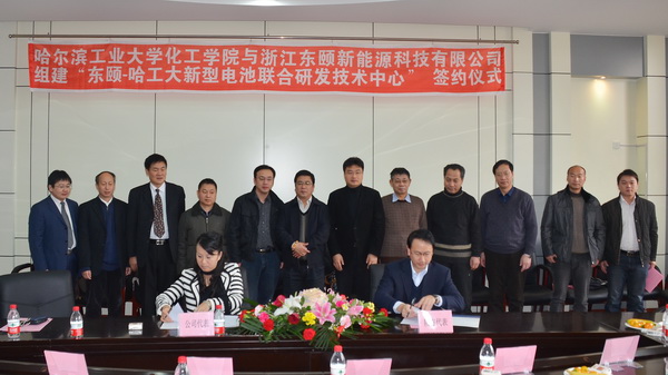 哈工大报讯(木叶 文/图)12月3日上午,东颐-哈工大新型电池联合研发技术中心签约仪式在校举行。化工公司经理黄玉东和浙江东颐新能源科技有限公司总经理郑燕燕代表双方签署了合作协议。董事长助理安实致辞。