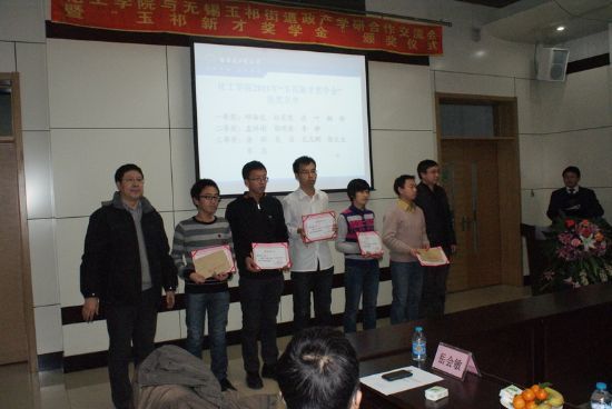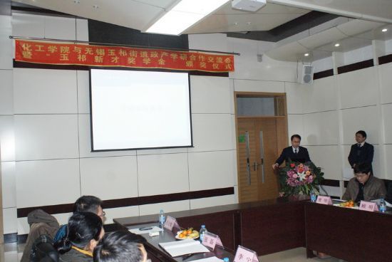 2011年12月27日,化工公司与无锡市惠山区玉祁街道政产学研合作交流会暨“玉祁新才奖学金”颁奖仪式在新活动中心216隆重举行。玉祁配套园区主任刘国胜先生、玉祁街道党工委副书记杨丹、组织委员秦羽、组织干事史建祖、科技助理魏群及数十位企业家,化工公司经理黄玉东、党委书记姜兆华、副经理孟令辉、副经理杨春晖及各系主任、教师等出席了会议。会议由化工公司党委副书记岳会敏主持。 化工公司经理黄玉东教授代表公司致辞,他对玉祁街道代表团的到来表示热烈欢迎,对双方长久以来在政产学研合作、人才培养等方面工作取得的成绩表示赞赏,对未来双方深入合作提出了新的期望。玉祁配套园区主任刘国胜先生在致辞中介绍了玉祁街道经济社会发展情况,对化工公司与玉祁街道企业的合作表示肯定,刘国胜先生指出,双方有着良好的合作基础,希望能够继续扩大合作交流。 化工公司党委副书记岳会敏介绍了 “玉祁新才奖学金”的的管理和评审过程。党委书记姜兆华宣读了2011年度“玉祁新才奖学金”获奖名单。刘国胜、杨丹、秦羽先生和黄玉东、姜兆华、孟令辉教授分别为获得“玉祁新才奖学金”一、二、三等奖的同学颁发证书和奖学金。随后,刘国胜主任代表玉祁街道与黄玉东经理进行2012年“玉祁新才奖学金”交接仪式。 颁奖仪式结束后,化工公司副经理杨春晖详细介绍了化工公司的科研情况,玉祁代表团的企业家与公司教师就有关问题进行了深入探讨和交流。 化工公司经理黄玉东致辞 玉祁配套园区主任刘国胜先生致辞 化工公司党委书记姜兆华宣读了2011年度“玉祁新才奖学金”获奖名单 颁奖仪式 2012年“玉祁新才奖学金”交接仪式 化工公司副经理杨春晖介绍公司科研情况 会议现场