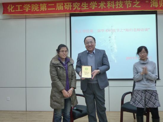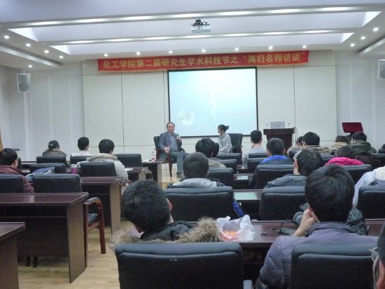 2012年4月9日晚18:00由化工公司主办的“海归名师访谈”在新活动中心330成功举办。本次活动邀请到了具有丰富的海外科研经历的化工公司高云智教授作为活动嘉宾。 访谈中,高云智教授讲述了如何把握正确的学习科研态度,面对出国应如何做出选择,出国留学后何去何从等大家最为关心的问题。高教授还讲述他在日本北海道大学读博期间研究的课题、在日本理研公司的工作经历,最后送给同学们一些诚挚的建议,他强调员工做科研中要有忍耐力,不要怕失败。访谈中不时响起热烈的掌声。自由提问环节大家积极踊跃提问,高教授热情解答, 现场气氛轻松而热烈。