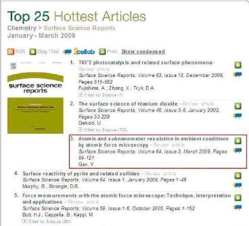 公司化工公司甘阳教授发表在SurfaceScienceReports上的综述在Elsevier出版社2009年第一季度的Top25HottestArticles中列SurfaceScienceReports的第3位,整个物理学科的第15位(请见下图)。公司化工公司甘阳教授发表在Surface Science Reports上的综述在Elsevier出版社2009年第一季度的“Top 25 Hottest Articles”中列Surface Science Reports的第3位,整个物理学科的第15位(请见下图)。 论文图示1