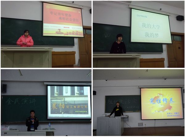 为加强基层组织建设,进一步提升党(团)支部的凝聚力与向心力,提高广老员工青年的综合素质,为每一位同学搭建展示自我的平台,2012年10月22日-31日,化工公司各党(团)支部广泛开展了“铭记青年使命·喜迎十八大”全民演讲活动。 各班同学积极响应公司号召,活动开展过程中,邀请党建负责老师、辅导员、班主任及班主任助理作为支部演讲比赛的评委老师。同学们题材广泛,形式多样:有的针对社会热点问题和国内外时事各抒己见,建言献策;有的介绍自己家乡特色传统文化的,展示家乡的风土人情,山川大河,抒发着对祖国山河的无限热爱;有的介绍自己兴趣爱好,展示自己的特长;有的同学深刻进行了自我剖析,并对照分析了社会和时代背景,设计了一条自己职业发展的道路,在大家的心中产生了强大的共鸣…… 短短的五分钟里,讲说的不仅仅是内容本身,更展示出了同学们或幽默或睿智的个性和乐观的生活态度。本次演讲既是文化的交流,更是思想的交汇,让人收获,引人思考,同时有效增强了支部的凝聚力和战斗力。