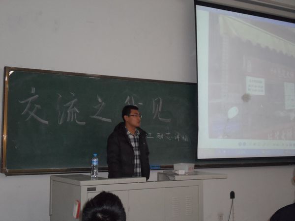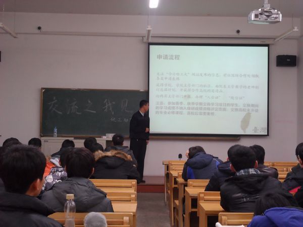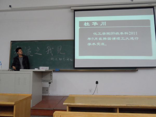 2012年12月14日16:00,由励志化工讲坛组织的韩国、台湾访学交流会在正心106教室成功举办。本次活动邀请到三名分别在韩国、台湾交流学习过的优秀员工代表,为本科生畅谈了自己的经历和体会。 11级硕士生刘磊,展示了在国立清华大学学术交流的环境与文化,并介绍了申请流程。09级本科生海洋,就中国文化大学研习通选类课程及参与的文化交流活动进行介绍,为同学们展现了不一样的台湾文化。09级本科杜华川,通过回顾一年韩国浦项工业大学的交流生活,让同学们了解到韩国教育的特点和独特的异国文化。 提问交流环节中,三位代表耐心为同学们解答了交流方面的问题,并提出了诸多中肯可行的建议,现场气氛热烈。