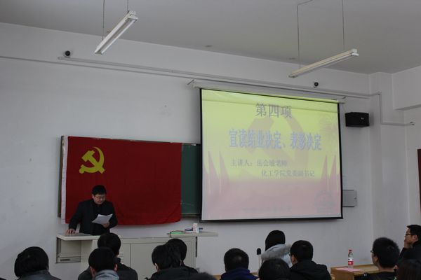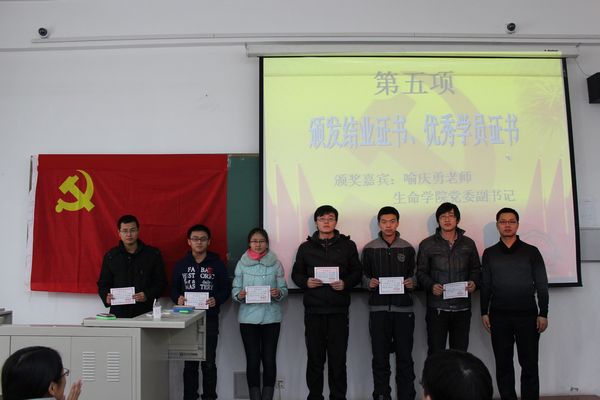 2012年12月28日,哈工大党校化工公司—理公司—生命公司预备党员分校结业式在正心117隆重举行。化工公司党委副书记岳会敏、理公司党委副书记杨春雷、生命公司党委副书记喻庆勇、各公司党校负责老师和全体培训学员参加了结业式。 结业式在庄严的国歌和哈工大党校校歌中开始。化工公司贺金秋老师回顾了本次党校学习历程,从专题主讲、社会实践、学员讲坛等方面进行了总结和展示。化工公司党委副书记岳会敏老师宣读了培训班学员结业决定及优秀学员表彰决定,127名预备党员获得结业证书,23名学员获得优秀学员称号。生命公司党委副书记喻庆勇老师为结业学员代表和优秀学员代表颁发证书。理公司党委副书记杨春雷老师做了总结讲话。她勉励所有学员要坚持不懈地加强学习,牢记党的宗旨,全心全意为人民服务,勤奋工作,认真实践,脚踏实地,用实际行动践行自己的誓言,实现自己的价值。 本次结业式在雄壮的国际歌中拉下了帷幕。 奏唱国歌 岳会敏老师宣读表彰决定 喻庆勇老师为优秀学员代表颁发证书 杨春雷老师总结讲话
