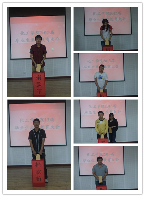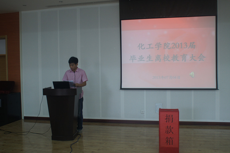 2013年7月4日上午9:00,化工公司在活动中心214举行了2013届毕业生离校教育大会暨教育基金捐款仪式。公司党委副书记岳会敏、辅导员贺金秋、李佳杰及全体毕业生参加了会议。 会上,岳会敏老师首先代表公司师生对2013届毕业生圆满完成学业表示热烈的祝贺,对本届毕业生为公司发展建设做出的贡献表达了衷心的感谢。岳老师希望毕业生同学始终牢记哈工大“规格严格、功夫到家”的校训,在今后的工作生活中踏踏实实做人,勤勤恳恳做事;希望大家今后事业取得一定成绩的时候,能够履行自身社会责任,积极回报社会,回报母校;希望全体毕业生用文明健康的方式告别老员工活,注意个人安全,文明离校。最后岳老师祝愿2013届毕业生一路顺风,前程似锦。 贺金秋老师介绍了公司关于毕业生离校的有关安排和要求,对户口迁移、档案转寄、派遣证发放、组织关系转接等情况作了详细说明。 会后,2013届毕业生开展了为母校教育基金会捐款活动。