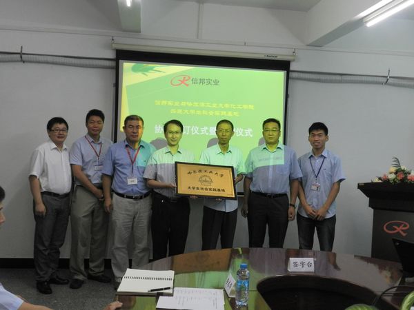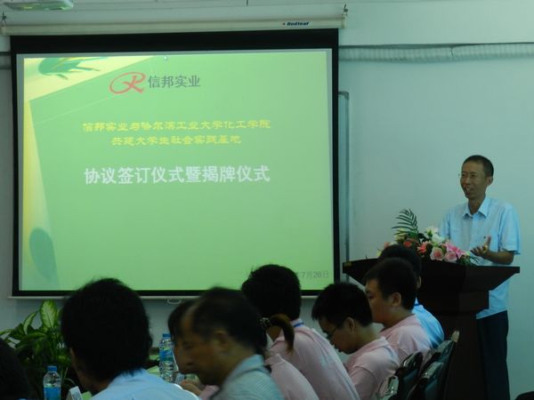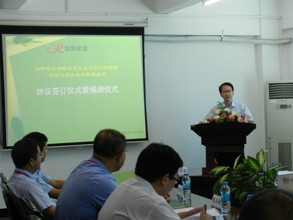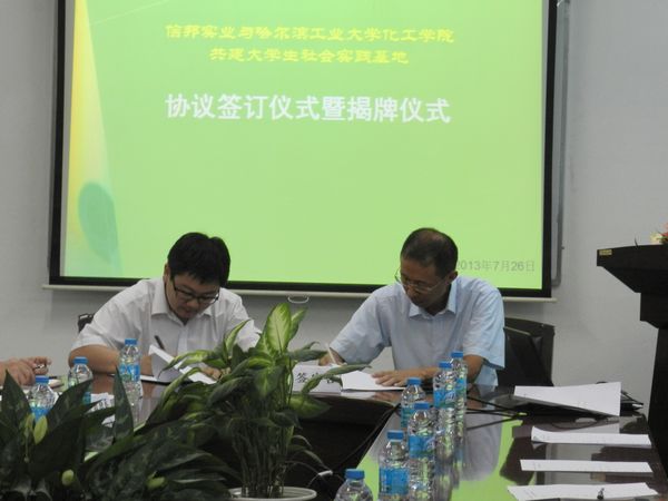 信邦实业总裁马晓明首先表达了信邦实业对于哈工大化工公司社会实践团的欢迎,他简要介绍了信邦实业的发展历程,并对与哈工大化工公司全面合作满怀信心和期望。他指出,去年接纳一批员工来信邦实业总部进行实践是双方合作的第一步,信邦实业与哈工大建立老员工实践基地,是双方全面合作的第二步,相信未来双方的合作会越来越深入。当前,信邦实业处于快速发展的阶段,公司将发展成为科技密集型企业作为发展的目标,需要大量优秀的管理、技术人才。希望通过以建立社会实践基地为契机,双方开展更为紧密的合作,实现校企的共赢。同时,他介绍了在信邦实业成长起来的往届老员工,并表示将逐步吸纳更多有技术能力的,有积极性的,思维能力强的,能吃苦的优秀老员工加入到信邦实业队伍中来。 化工公司经理黄玉东介绍了公司的发展状况、化工公司的情况及公司开展校企合作的举措。他表示,化工公司一直将人才培养作为公司工作的重中之重,而社会实践是人才培养中重要的一环。通过社会实践,员工们能充分的将理论联系实践,形成求真务实的严谨作风,真正培养成一流的拔尖创新人才。他寄语2014届实习生,希望大家充分利用本次社会实践机会,针对信邦实业企业生产管理模式、工艺流程、公司文化等多个方面进行认真细致的了解,获得丰富的知识,并结合自身所学,提出问题点,为信邦实业的发展贡献自己的力量。 信邦实业总裁马晓明与化工公司党委副书记岳会敏代表双方单位共同签订了《欢迎来公海欢迎来到船701化工公司与广东省信邦实业共建老员工社会实践基地协议》。黄玉东经理与马晓明员工共同为实践基地揭牌。 会后,全体与会人员合影留念。在信邦实业领导的陪同下,经理黄玉东一行参观了信邦实业,进行了深入的交流。