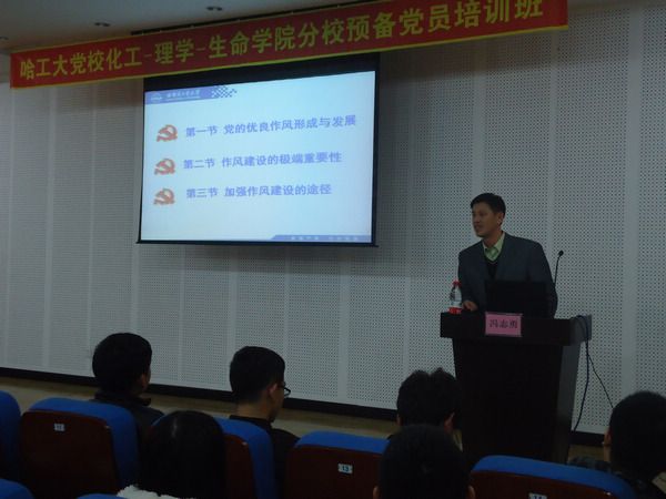 冯老师以“加强作风建设,永葆共产党人的先进性”为主题,从党的优良作风与发展、作风建设的极端重要性以及加强作风建设的途径三个方面为我们阐述党的作风建设。在讲座中,冯老师从党的成立开始到现在,我们党优良作风的形成过程;从我国历史和文化、中外政党的发展过程以及党在新形势下的新任务这三个方面阐述了党的作风建设的重要性。并希望我们能够在今后的学习生活中,能够讲党性,重品行,做表率。在讲座过程中,同学们都认真聆听,现场不断爆发出阵阵掌声。