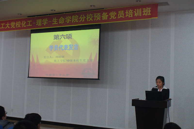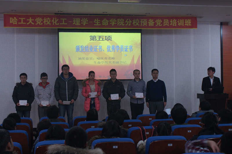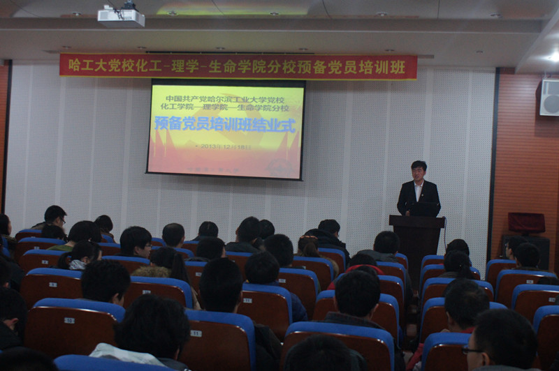 2013年12月18日,化工公司—理公司—生命公司预备党员培训班结业式在活动中心227顺利举行。理公司党委副书记杨春雷、化工公司党委副书记岳会敏、生命公司党委副书记喻庆勇和全体培训学员参加了结业式。 结业式在庄严的《中华人民共和国国歌》和《哈工大党校校歌》中拉开帷幕。随后通过视频形式,一起回顾了党校学习历程。本次预备党员党校培训班共组织专题讲座五次,特邀专家讲座一次。董嵩斌老师慷慨激昂,陈立媛老师高屋建瓴,刘丽美老师娓娓道来,冯智勇老师深入浅出,李敬伟老师意味深长,高献忠老师诙谐幽默,老师们的授课让学员在感受快乐的同时,也收获了系统的知识。每次讲座后组织了学员讲坛活动,给大家提供了展现自己的机会。课后以小组为单位组织主题实践调研活动和志愿服务活动。课后的社会实践、志愿服务等活动,很大程度提高了我们理性分析问题和解决问题的能力,这将有助于我们在今后的工作中,以科学的思维方法和全局观念去化解问题。 杨春雷老师宣读了党校学员结业决定和表彰决定,喻庆勇老师为学员代表颁发证书。学员代表刘迎迎发言表示,通过将近两个月的党校学习,全体学员在思想上和行动上已取得了很大的进步,并表示在今后的学习和工作中,进一步提高自己的理论水平和政治素质,不断加强党性修养。岳老师首先对通过培训班考核的学员表示祝贺,并对大家提出了要求:希望大家进一步端正入党动机,不断深化对党创新理论的学习,不断增强责任心和使命感,处处体现党员的先锋模范作用。 结业式伴随着庄严的《国际歌》中落下帷幕。