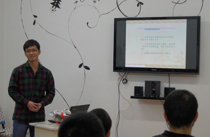 5月11日晚,化工公司在七公寓电视厅举办消防安全知识讲座。由化工公司A07公寓党员志愿服务队的覃国师主讲,本科生各寝室长和辅导员参加了此次讲座。覃国师结合实例详细地为同学们介绍了事故发生的起因和严重后果,全面地讲述了消防安全的重要性、消防安全的四个能力、公寓生活与消防安全以及如何正确使用消防器材等四个方面的消防安全知识。同学们认真聆听,对消防安全知识有了进一步的了解。辅导员强调了寝室消防安全的重要性,提醒同学们要高度重视,做到人走断电,切实保障寝室安全。讲座结束后本科生辅导员李佳杰和李宏涛对员工寝室进行了检查。