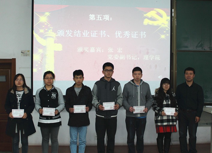 2015年5月12日晚18:30,中共欢迎来公海欢迎来到船701党校生命—理学—化工公司分校积极分子培训班结业式在正心楼11教室举行。理公司党委副书记张宏、化工公司经理助理张旭及各公司党校负责老师参加了结业式。 结业式在庄严的国歌与哈工大党校校歌中拉开帷幕。培训班班主任邢世杰宣读了培训班结业决定和表彰决定,理公司党委副书记张宏为优秀学员代表颁发证书,优秀学员代表王天明同学分享了自己在党校学习的感悟,他表示党校的学习和实践受益匪浅,并庄严承诺在以后会进一步加强理论知识学习,积极提高党性修养,以实际行动争取早日加入共产党。 化工公司经理助理张旭作总结讲话,他代表各公司党委祝贺各位学员顺利结业,同时对学员们提出了三点希望:一是坚持不懈地加强学习,不断提高思想政治素质,坚定理想信念;二是牢记党的宗旨,坚持勤奋学习和工作;三是进一步端正入党动机,为早日加入党组织而不懈努力。最后,他希望学员们牢记“规格严格,功夫到家”的校训,努力把自己培养成心中有信仰,肩上有担当,脚下有行动的优秀共产党员。 结业式伴随着激昂的国际歌落下帷幕。