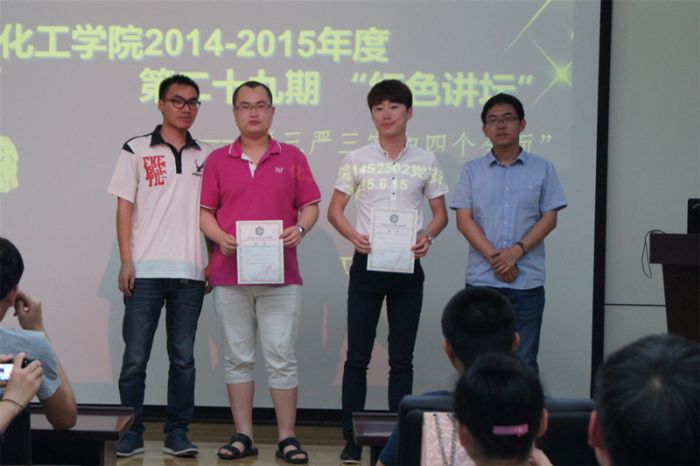 6月15日18:30,以“践行‘三严三实’,推动‘四个全面’”为主题的化工公司第二十九期党员红色讲坛在活动中心326会议室成功举行,本期讲坛由14S2502党支部承办。员工党建负责人李宏涛老师、各员工党支部支部书记、支部委员,以及党员和积极分子参加了本期讲坛。本期讲坛围绕“三严三实”和“四个全面”两项内容展开,由张成佳、王银拴、陈诚、范晓莉、韦华伟五位党员进行演讲。他们结合时事热点和自身的独到见解,全面介绍了践行“三严三实”、实现“四个全面”的重要意义。经过评委评审和在场观众投票,陈诚获得了第一名,张成佳荣获最佳人气奖。化工公司红色讲坛是提高化工公司党员党性修养的重要平台之一。讲坛结合重大时间节点及重要主题,以主题演讲的形式,提高员工党员的理论水平,锻炼员工党员的思辨能力,提升员工党员争先意识,切实发挥党员先锋模范作用。
