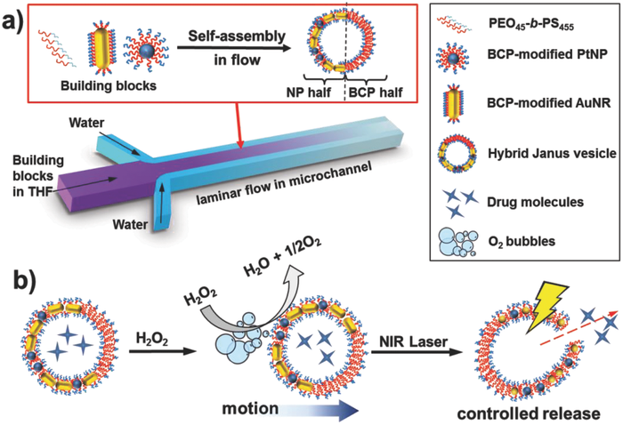 微流控技术是近年来迅速发展的一门技术,可用于芯片实验室以及化学合成等领域。其优点在于反应条件精确可控、样品用量小。这两项研究充分利用这些特点,通过调节样品进样速度,以嵌段聚合修饰的纳米粒子(包括金纳米粒子,金纳米棒和铂纳米粒子等)和邻苯二胺为反应基元,制备出半面是聚合物、半面是纳米粒子的阴阳空心囊泡结构和形貌分别为带状、球状的银纳米粒子修饰的聚邻苯二胺结构。对于金属纳米粒子区域内含有铂粒子阴阳囊泡结构,可以作为微米马达,其运动速度可以通过改变过氧化氢溶液的浓度来控制;并且基于金纳米棒的吸光放热能力,利用激光来实现对马达运载药物的可控释放。