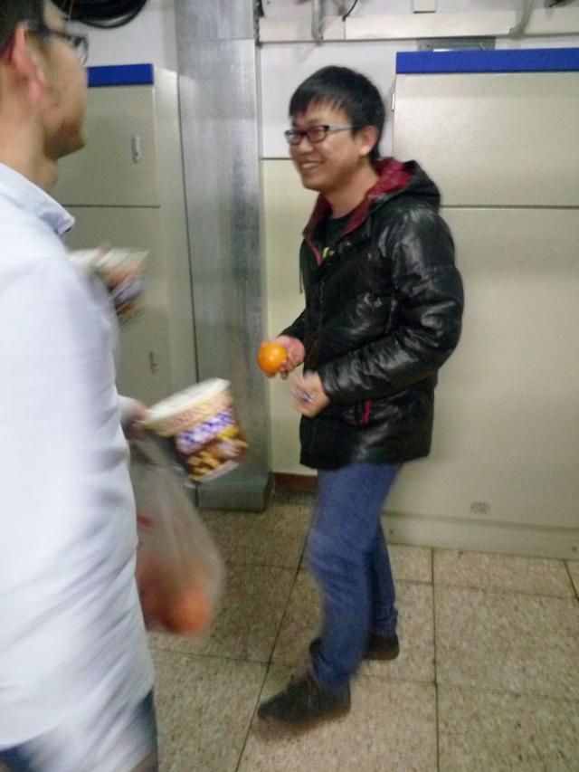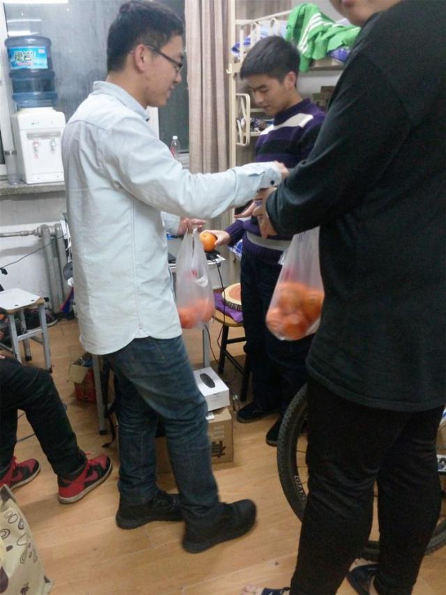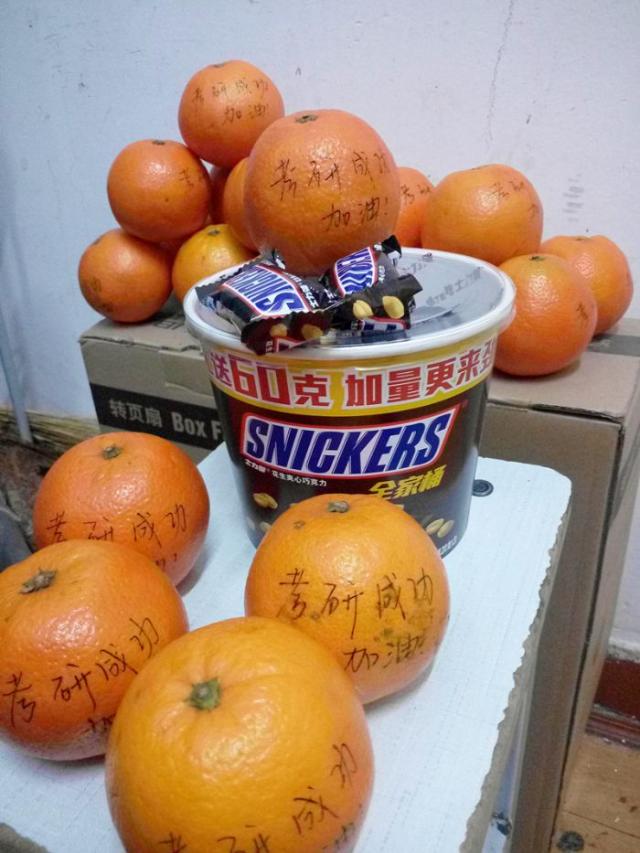 2015年12月21日晚,化工公司辅导员李宏涛走进七公寓各寝室,对2012级的考研同学进行考前慰问。李老师向同学们询问了近期的学习和生活状况,从实际情况出发,针对心态调节、备考方法等提出了建议,并送上公司精心准备的两份礼物,写有“考研成功,加油”祝福语的橙子和士力架。公司2012级各班班主任老师也给同学们送上了巧克力、酸奶等,并通过短信、走访寝室等,为复习备考的同学送去正能量与深切祝福。