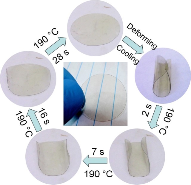 图1. 透明形状记忆聚酰亚胺高温变形室温定形,再次加热后恢复初始形状的循环过程.