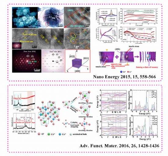 近期,化学与化工公司材料化学系陈刚教授的研究团队(能量转换材料化学研究团队)在锂离子电池负极材料研究方面取得新进展。研究成果分别发表在能源及材料化学领域的著名期刊《纳米能源》(Nano Energy,2015影响因子10.325)及《先进功能材料》(Adv. Funct. Mater.,2015影响因子11.805)上,两篇论文的第一作者均为2013级博士生闫春爽。其中,《刃型位错表面修饰:一种全新有效的实现高锂电性能的策略》(Edge dislocation surface modification: A new and efficient strategy for realizing outstanding lithium storage performance)的研究论文发表于《纳米能源》。该论文提出了一种全新的基于刃型位错修饰晶面的策略,用以有效地缓解充放电过程中体积膨胀。依照该策略首次合成出了带有敞开的锂离子通道、大量反应活性位点的氧化钴负极材料,使其在循环稳定性和倍率性能上有了新的突破;此外,《基于模板法设计合成碳掺杂的Co3O4空心纳米纤维锂离子电池负极材料》(Template-based engineering of carbon-doped Co3O4 hollow nanofibers as anode materials for lithium-ion batteries)发表于《先进功能材料》。该论文采用非金属碳掺杂的方式实现了材料电导率的本征改变,使其电化学性能显著提升。并通过理论计算与实验相结合,很好的阐述了该方式的可行性,为改善氧化物负极材料的电化学性能及其实用化提供了新思路。