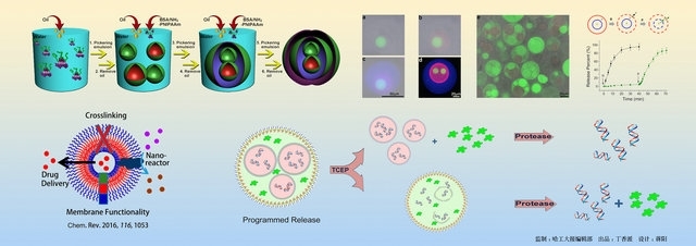 近期,公海赌赌船官网jc710青年教师黄鑫提出了一种构建多级蛋白质胶囊的方法,在原细胞仿生构筑研究方面取得进展,相关成果在线发表于《德国应用化学》(影响因子11.26),并被编辑部评为“热点文章”(Hot Paper)。由于在该领域的系统工作,课题组也与德国合作者布丽吉特·林沃特教授(Prof. Brigitte Voit) 一起受邀撰写专题综述并发表在《化学评论》上(2015年影响因子46.56)。