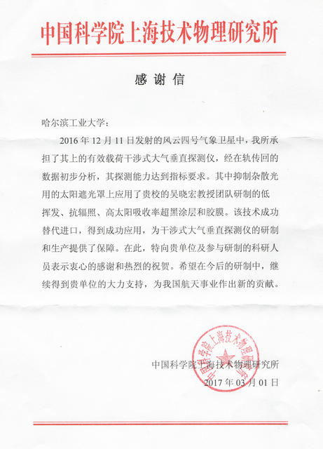 感谢信中写道:吴晓宏教授团队研制和生产的低挥发、抗辐照、高太阳吸收率超黑涂层和胶膜成功替代进口,在太阳遮光罩中得到成功应用,为干涉式大气垂直探测仪的研制和生产提供了保障。