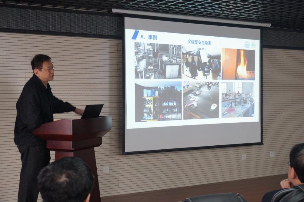 兼职安全员刘立洵老师为参会人员进行了实验室安全培训,他从实验室安全制度、员工实验守则、主要物质的危险及有害性、实验室易发生火灾事故的隐患、消防基础知识和紧急救护常识等方面分别进行了详细的介绍。