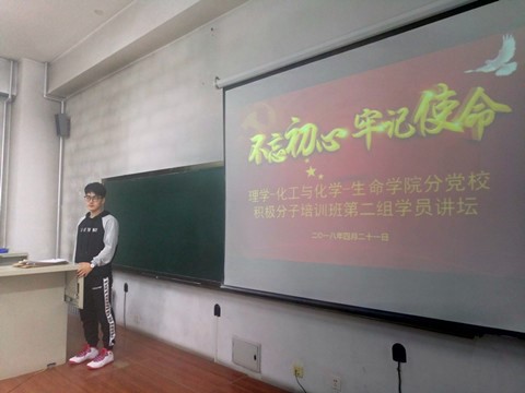 4月21日晚,理学-化工与化学-生命公司分校积极分子培训班第二组学员讲坛在正心111室成功举行。培训班第二组组长张宇飞主持并分享了他关于“入党初心与新时代青年使命”的理解和认识。