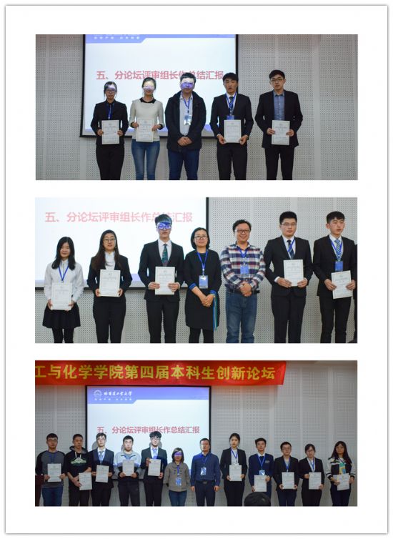各分论坛中,每位答辩同学都作了精彩的展示,评委老师们耐心审核、悉心点评,与莘莘学子们碰撞出智慧的火花。经过学术报告、交流提问与评委点评等环节,本届论坛共评选出一等奖4名,二等奖8名,三等奖12名。闭幕式上,各论坛负责老师对各个分论坛情况进行了总结,公司党委副书记张旭老师、化学系副主任赵立彦老师,生物化工系副主任穆韡等为获奖同学颁发奖状并合影留念。最后,党委副书记张旭老师为本科生创新论坛致闭幕词。