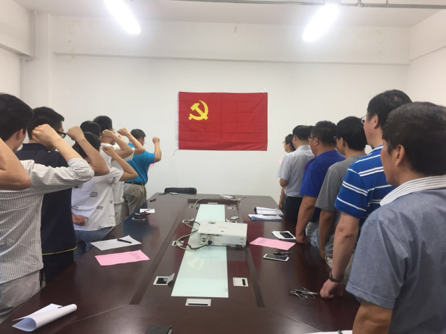 全体师生党员在党旗下庄严宣誓,共同重温入党誓词。