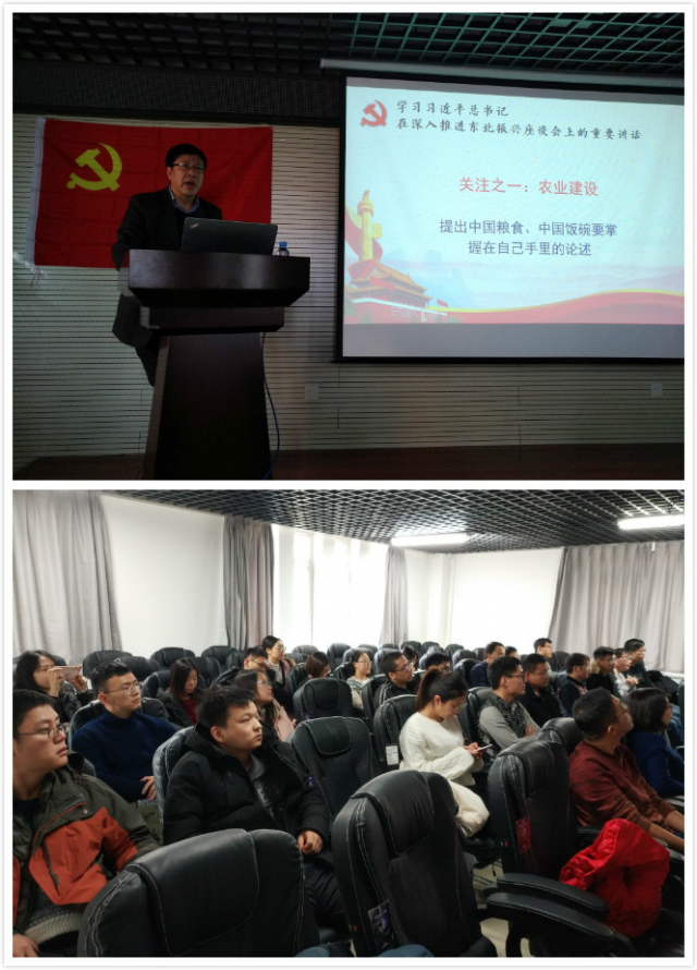 孟令辉回顾了习总书记在党的十八大以来对东北三省的历次考察和调研情况,结合东北发展实际,对习总书记在深入推进东北振兴座谈会上的重要讲话做了全面系统的辅导解读。他强调,习总书记对东北三省的多次考察和调研充分显示了党和国家对东北振兴的高度重视,特别是在当前东北振兴发展的关键时期和复杂多变的国际形势下,更彰显着党中央扎实推进既定战略部署、集中精力办好自己事的深谋远虑和战略定力。习总书记在此次座谈会上的重要讲话为东北振兴指明了前进方向,也给出了关于东北振兴整体性的方法论,指出了东北振兴需要毫不动摇地坚持改革开放,坚持以新发展理念为行动先导。孟老师也寄语全体师生党员要发挥模范带头作用,立足岗位做好本职工作,义不容辞地为东北振兴贡献力量。
