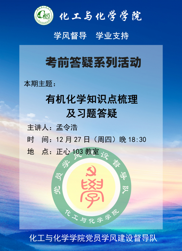 公司党员学风督导队将于12月27日(周四)晚18:30开展有机化学知识点梳理和习题答疑。