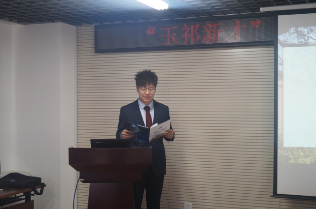 2017级研究生华可作为员工代表发言。他对玉祁街道的资助表示感谢,随后他介绍了自己大学期间在学习、科研、社团活动等方面所取得的成果,并表示要继续发扬“规格严格,功夫到家”的校训精神,不断努力,不辜负玉祁新才奖学金的精神与宗旨,不辜负各位领导、企业家、老师们的期望。