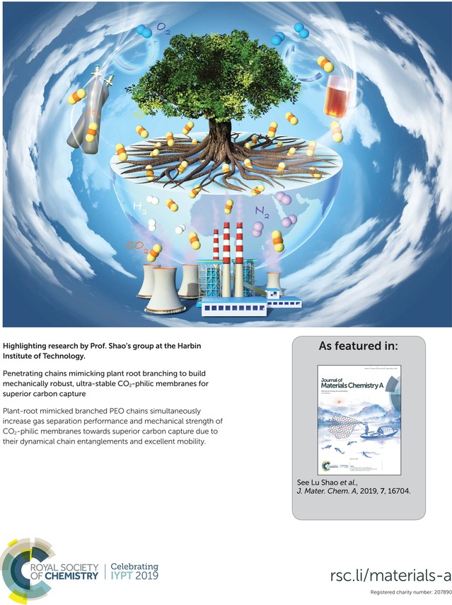 近日,公司公海赌赌船官网jc710教授、城市水资源与水环境国家重点实验室成员邵路课题组在合成高渗透性、高强度CO2亲和性分离膜方向取得重要研究成果,该成果通过在交联聚氧化乙烯(PEO)分离膜中原位生成支化的穿插分子,实现了对PEO分离膜气体渗透性能和机械性能的同步提高。研究成果以仿植物根系穿插分子链构筑高强度、高稳定性CO2气体分离膜(Penetrating chains mimicking plant root branching to build mechanically robust, ultra-stable CO2-philic membranes for superior carbon capture)为题,发表在国际著名期刊《材料化学A》(Journal of Materials Chemistry A,影响因子10.733),并被选为当期杂志背封面(Back cover)。