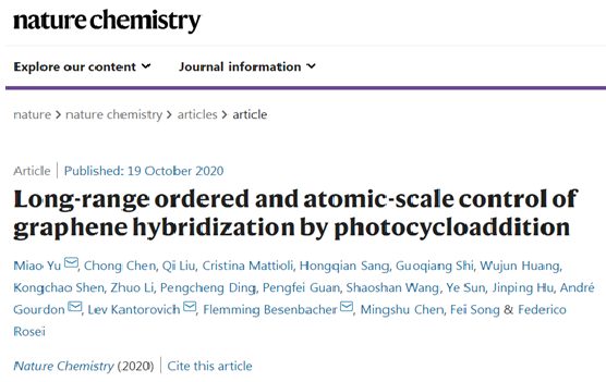 哈工大报讯(化工/文) 近日,公司于淼教授课题组在石墨烯功能化方面取得了重要进展。该工作为石墨烯光致精准功能化的首例,通过精细调控局域杂化模式打开石墨烯带隙,首次在原子尺度实现了石墨烯的二维长程有序功能化,为石墨烯基二维材料在电子器件和光电器件应用方面的关键难题提供了有效解决方法。相关研究成果以“通过光致环加成反应长程有序原子级调控石墨烯杂化(Long-range ordered and atomic-scale control of graphene hybridization by photocycloaddition)”为题,于2020年10月19日在线发表于国际知名学术刊物《自然•化学》(Nature Chemistry)。于淼教授为论文第一作者(通讯作者),欢迎来公海欢迎来到船701为第一单位,公司化工与化学学科首席学术顾问、哈尔滨-奥胡斯多尺度表界面国际研究中心(HAISI)荣誉主任弗莱明•贝森巴赫院士为共同通讯作者。