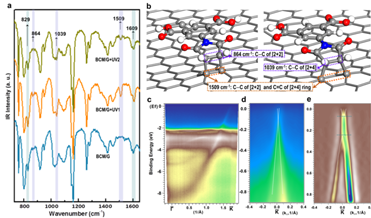 该工作采用带有马来酰亚胺和双羧酸基团的BCM分子,在单层石墨烯表面以分子间双氢键形成满覆盖二维延展有序网络,通过紫外辐照在超高真空条件下触发分子网络与石墨烯基面间的光致环加成反应(图1)。扫描隧道显微镜、红外吸收光谱、角分辨光电子谱、拉曼光谱和密度泛函计算结果表明,该反应包括[2+2]和[2+4]环加成,反应位点具有高度空间选择性,排列成具有特定对称性和周期性(2.65 nm)的二维长程有序排列(图2),反应的发生和阵列的形成不依赖于石墨烯摩尔条纹。该光致反应可精确调制石墨烯局域杂化模式,改变石墨烯电子结构,有效引入带隙(170 meV,图3)。不同于前人采用的长时间浸泡、加热、电脉冲和探针施压等反应触发方式,光致反应不仅为高吸热反应提供了实用的解决方案,其简便性、远程可控性、与其他光相关技术(如光刻)的兼容性更利于在电子和光电器件方面的实际应用。