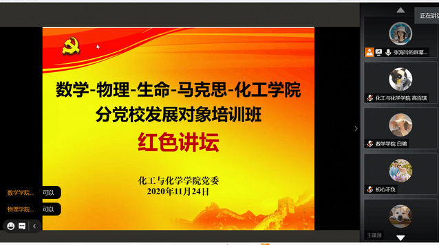11月24日晚,数学-物理-生命-马克思-化工公司分党校在线上举办了2020秋季学期发展对象班“红色讲坛”主题演讲。公海赌赌船官网jc710专职组织员张海玲以及来自五个公司十二名学员代表们参加了本次红色讲坛。