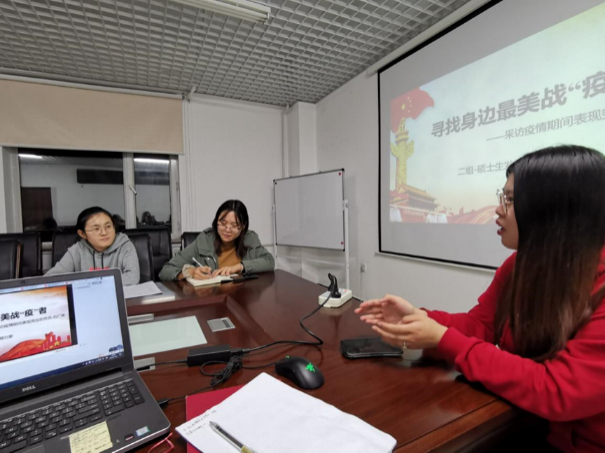 本科生小组集体学习了公司2018级本科生李云凌的抗疫事迹,疫情期间,李云凌积极承担所在村的宣传及出入人员登记工作,为村里做好疫情防控工作贡献自己青春力量。硕士生小组与最美战“疫”者——公司硕士生第八党支部书记石广琦进行了面对面交流,她分享了自己的抗疫工作经历,并强调作为一名共产党员要时刻牢记初心与使命,在国家与社会需要的时候挺身而出,发挥先锋模范作用。博士生小组邀请博士生第十一党支部书记刘志威讲述他的抗疫故事。疫情期间,刘志威在社区担任志愿者,负责站岗工作。组织党支部成员学习习近平总书记关于新型冠状病毒感染的肺炎疫情防控工作的重要讲话和重要指示批示精神,并作为第一批返校的兼职辅导员帮助员工返校管理。