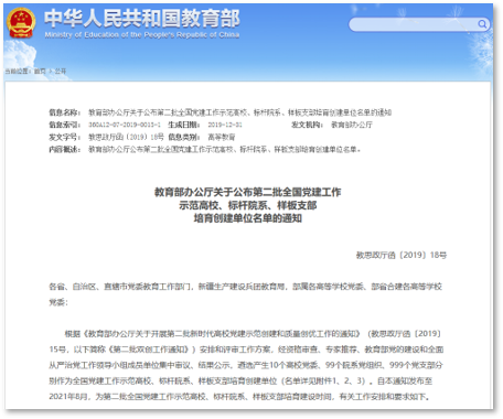 2020年1月8日,教育部公布了第二批全国党建工作示范高校、标杆院系、样板支部培育创建单位名单。公司党委入选第二批“全国党建工作标杆院系”。