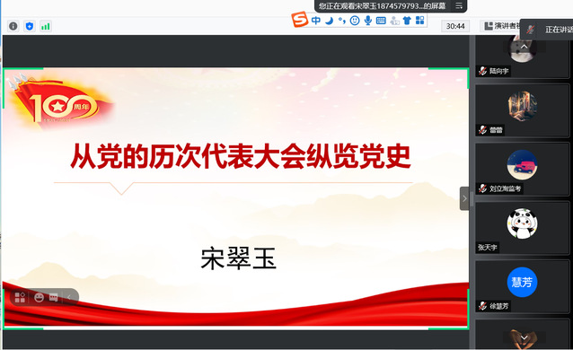 为深入贯彻落实习近平总书记在党史学习教育动员大会上的重要讲话精神,高标准高质量开展好党史学习教育,深化对党的历史的学习掌握,引领党员真正做到“学党史、悟思想、办实事、开新局”。6月16日下午,由公司党委主办、高分子科学与工程系教工党支部承办的化院百年党史讲堂第七讲成功开讲,邀请到省委党公司党史党建教研部副教授宋翠玉讲授“从历届党代会纵览党史”主题党课。