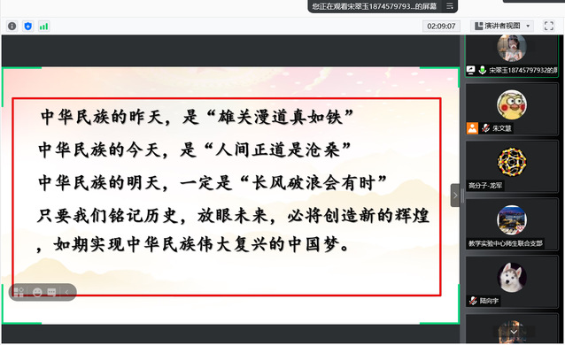宋翠玉带领大家沿着党的历次代表大会这条线索纵览党史,详细讲解了历次党代会的背景,主要内容及其影响和意义。从中共一大开天辟地的大事件,到中共十九大开启全面建设社会主义现代化国家新征程,党的发展并不是一帆风顺的,而是曲折性和前进性形影相随的,是在苦难中铸就辉煌的伟大历程。回顾党的百年奋斗史,我们曾经受了多次重大挫折,并且成功摆脱了这些困难。党曾多次经历关系自身前途命运及中国命运的历史关键点,而每一次党代会都召开在这些形势发展的关键时刻,深刻影响了中国的历史进程,历次党代会从历史纵向上清晰地反映了中国共产党对中国革命道路、中国特色社会主义道路的这种不懈的探索,同时也反映了党对马克思主义认识的不断深化以及对马克思主义中国化成果的与时俱进。只有细细品会、反复揣摩历代党代会,才能真正地读懂党的发展史。最后,宋翠玉总结道,中华民族的昨天,是“雄关漫道真如铁”,中华民族的今天,是“人间正道是沧桑”,中华民族的昨天,一定是“长风破浪会有时”,只要我们铭记历史,放眼未来,必将创造新的辉煌,如期实现中华民族伟大复兴的中国梦!