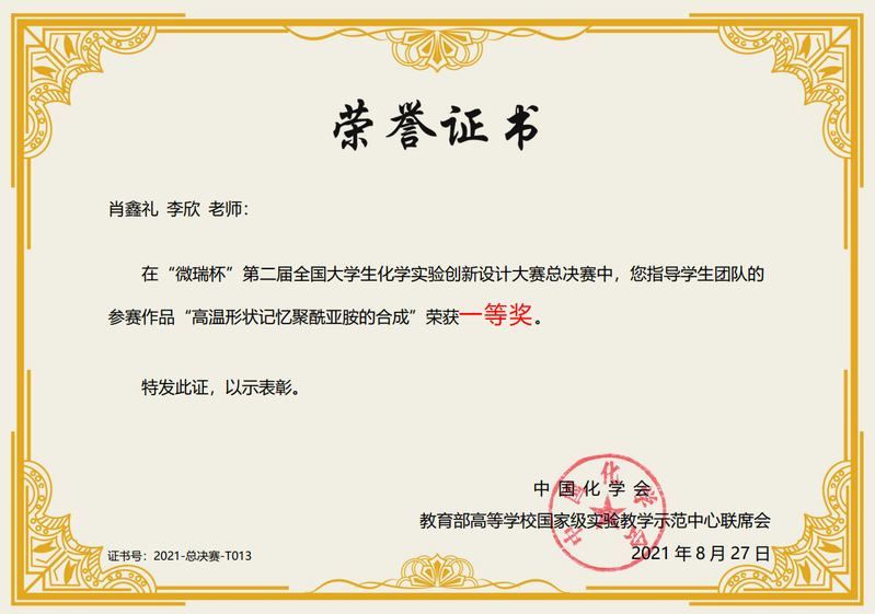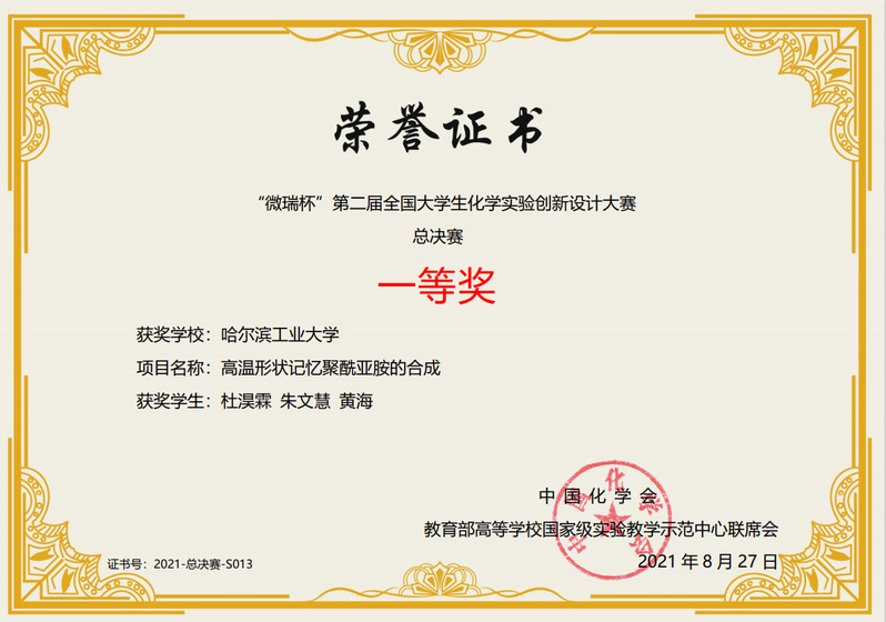 日前,由中国化学会和教育部高等公司国家级实验教学示范中心联席会主办的“微瑞杯”第二届全国老员工化学实验创新设计竞赛总决赛在青岛科技大学举行。经过华北、东北、华东、华中、华南、西南和西北等七个赛区的初赛角逐,在350多所参赛高校的800余支代表队中选拔出了90支代表队进入全国总决赛。总决赛中,由公司公海赌赌船官网jc710肖鑫礼、李欣为指导教师,杜淏霖、朱文慧和黄海同学组成的代表队以扎实的基本功和出色的答辩表现赢得了评委的肯定,最终以优异成绩荣获一等奖。